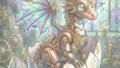 It features innocent eyes and brass gears mingling with soft downy feathers.