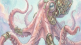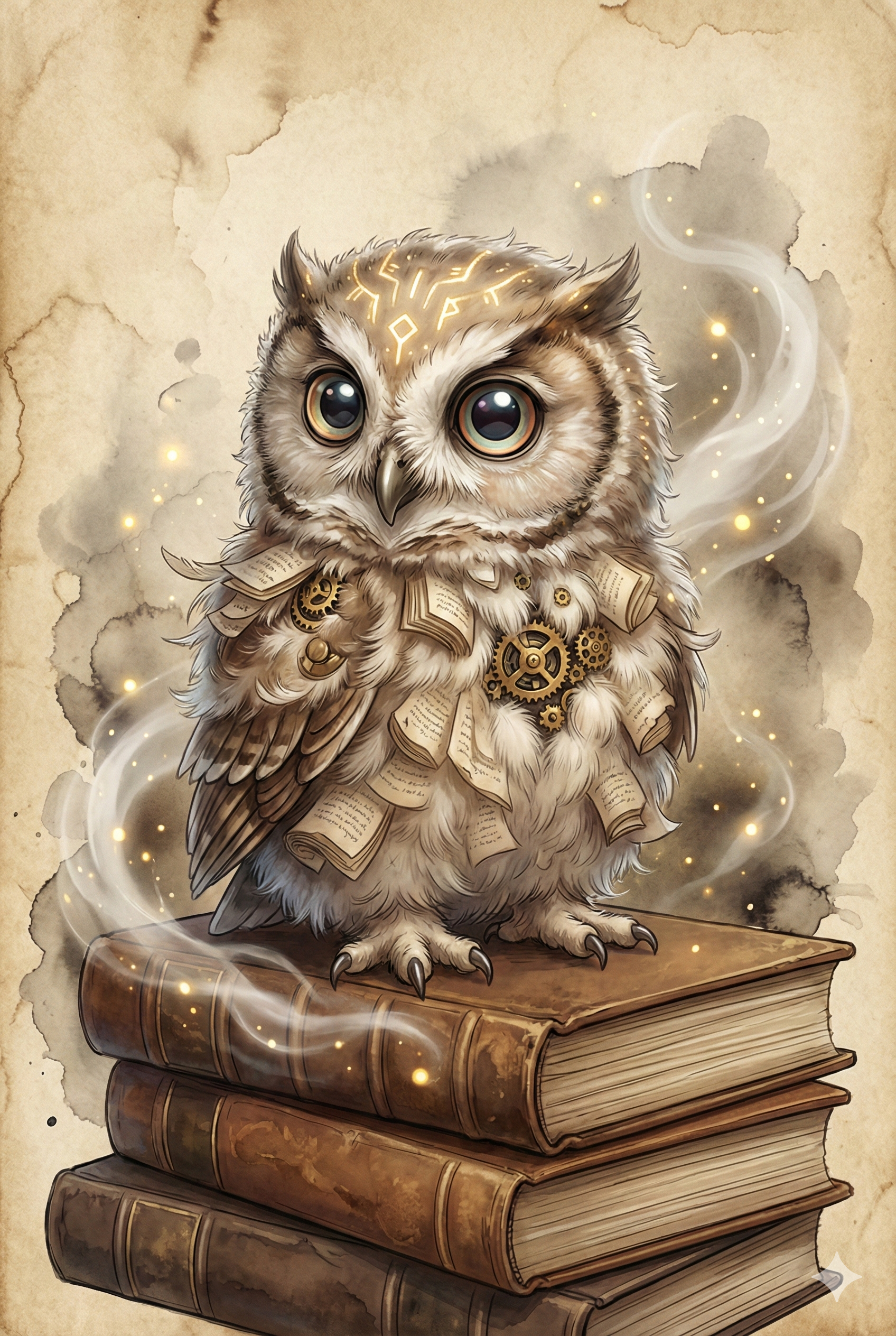 It features innocent eyes and brass gears mingling with soft downy feathers.