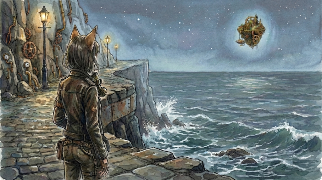 In the sky she looks up at, a pale moon and stars twinkle, but they are merely the cold afterglow from the floating island and the sparks of nightmares burned by the “Octopus” in the abyss, reflecting off the heavy toxic smoke.