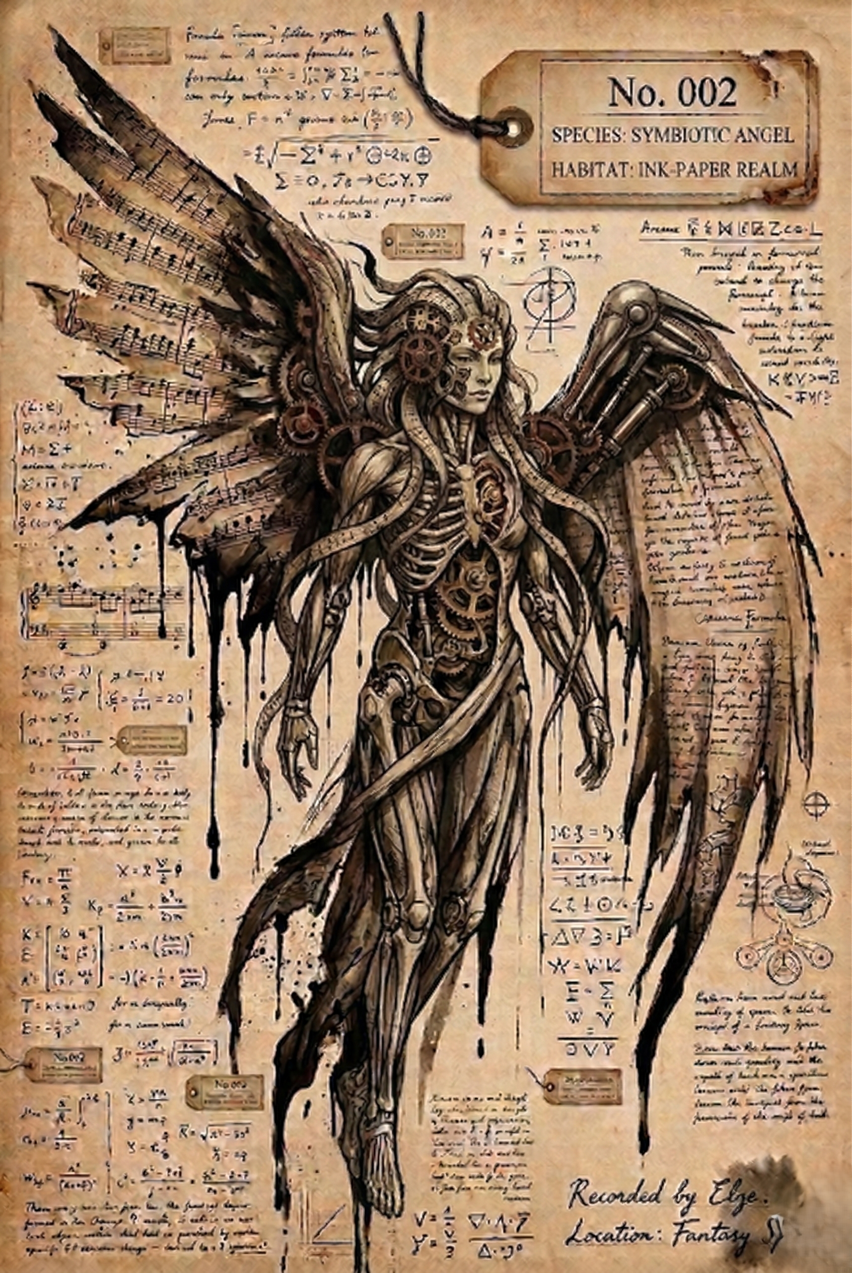 A record of an angel collected from the “Ink-Paper Realm,” possessing one wing made of musical scores and the other of brass machinery.