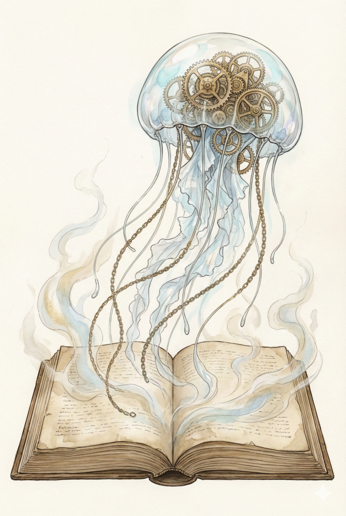 古書から昇る幻想。透明な触手が宙を舞い、静かな光を放つ。