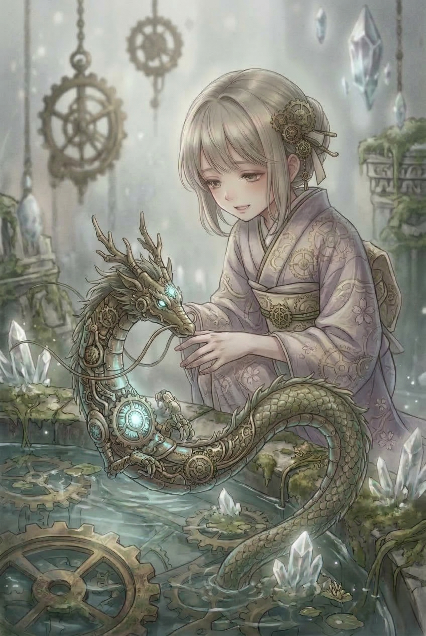龍の胸元で回転する歯車は、少女の指先から伝わる温もりに呼応するように柔らかな光を放ち、水面に真鍮の揺らぎを落とす。