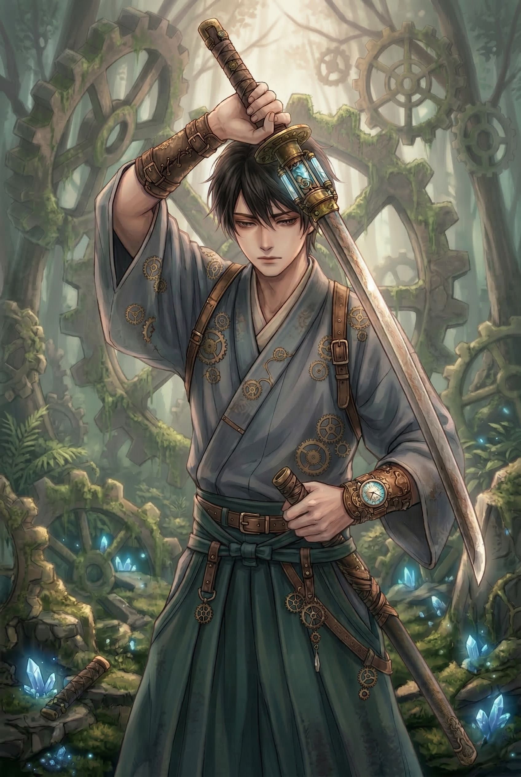 彼が纏う着物の柄、および腕のリストウォッチ型の駆動装置は、森の随所に芽吹く青き結晶の鼓動と同期し、微かな真鍮の軋みを立てる。