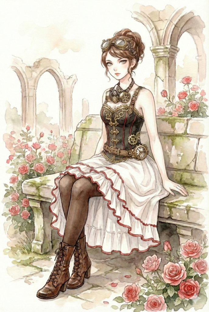 機械と自然が溶け合うこの場所で、彼女は過去と未来の境界線を見つめ続けている。
