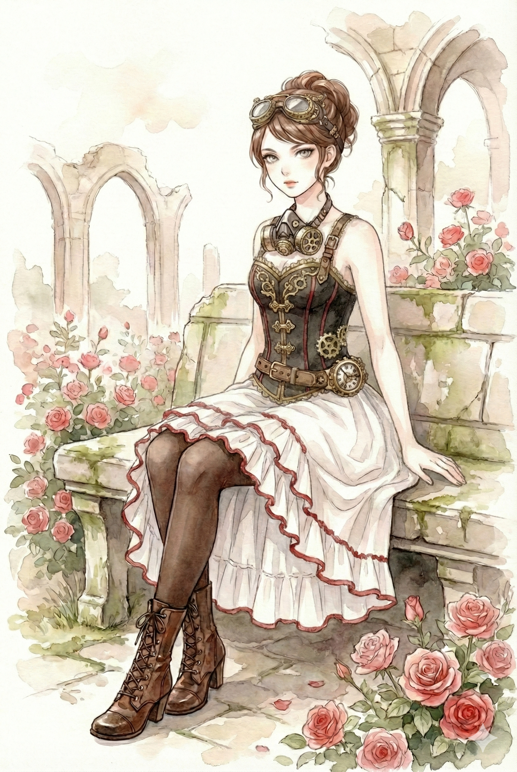 Surrounding her are roses blooming as if to swallow the gears.