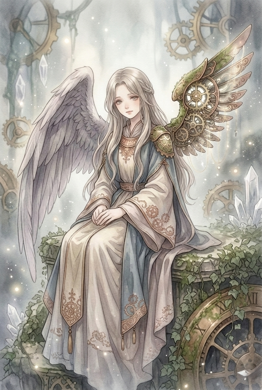 苔むした祭壇の歯車とクリスタルの微光が、彼女の静止した時間を静かに刻み続けている。